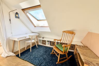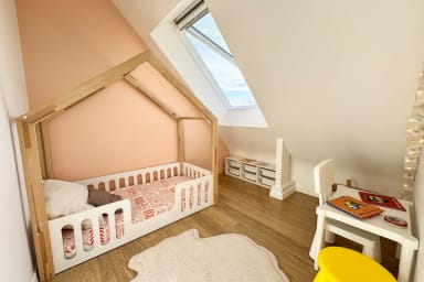 - Bedroom 3 with 160 cm double bed, storage space, relaxation area, desk and alcove with a bed for a small child.