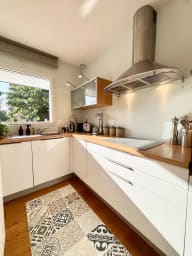 - Open-plan fitted and equipped kitchen with oven, dishwasher, refrigerator, coffee maker, kettle and toaster.