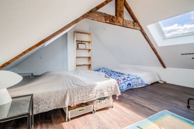 - Large bedroom with a 140/190 cm double bed, two 90/190 cm single beds and a desk area.