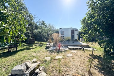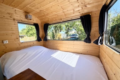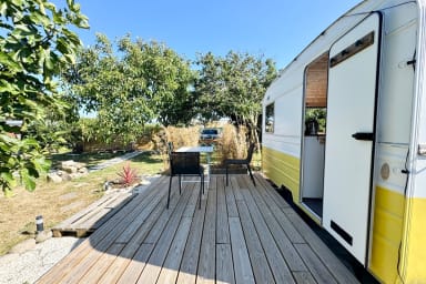 It can accommodate 4 people (6 with the sofa bed), and there is also a renovated vintage caravan with a double bed to accommodate two additional people.