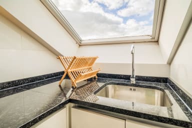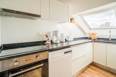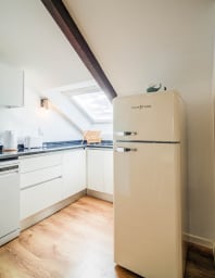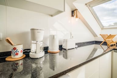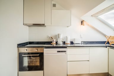- An open-plan, fitted and equipped kitchen: oven, refrigerator, toaster, kettle, coffee maker, and dishwasher.