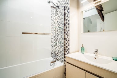- A bathroom with bathtub and sink.