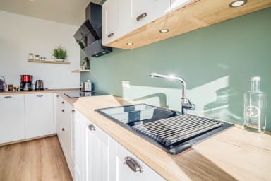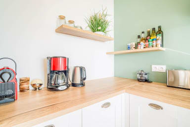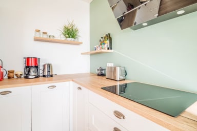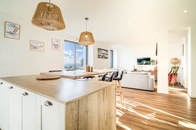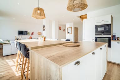 - Spacious living area with open-plan fitted and equipped kitchen: fridge, oven, hob, microwave, coffee maker, toaster, kettle, dishwasher and large central island