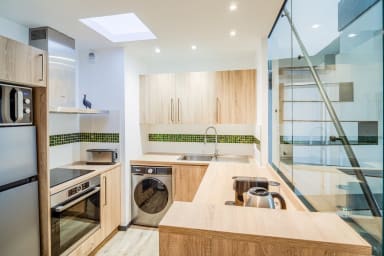 - Open-plan fitted and equipped kitchen: oven, microwave, refrigerator, dishwasher, toaster, kettle, coffee maker
