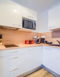 - Open-plan fitted and equipped kitchen: oven, microwave, refrigerator, kettle, coffee maker, toaster