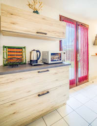 - Open-plan, fully equipped kitchen: fridge, oven, microwave, toaster, kettle, coffee maker