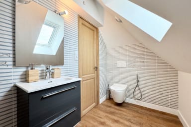 - First floor: 1 double bedroom with 160 cm bed + futon, WC with washbasin