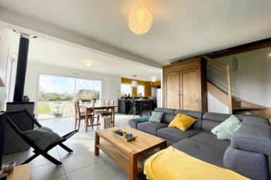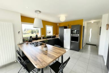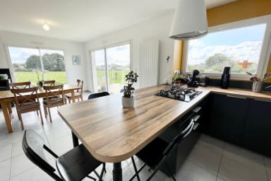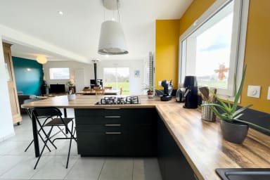 - Cuisine ouverte très fonctionnelle, bien équipée (bouilloire, cafetière, lave-vaisselle, frigo, grille-pain…) avec un accès sur le jardin.