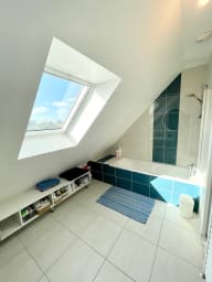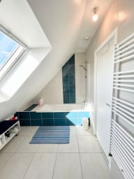 - Salle de bain avec baignoire, sèche-serviette, meuble double vasque
