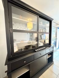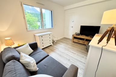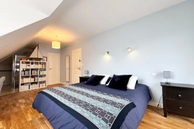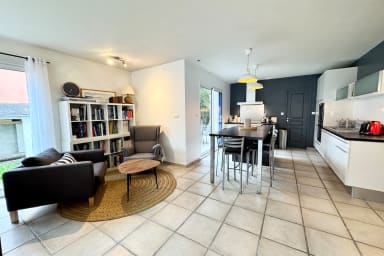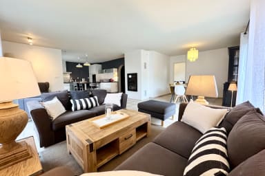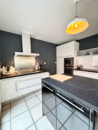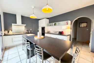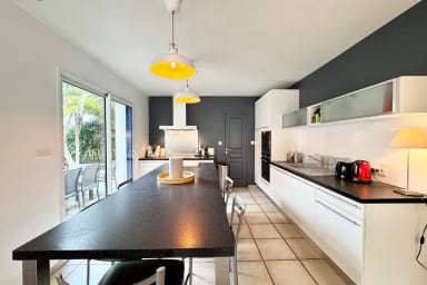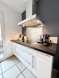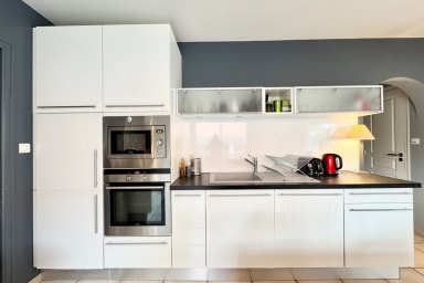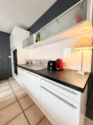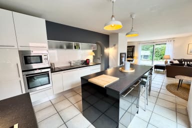 - Cuisine ouverte équipée, four, micro-onde, réfrigérateur, bouilloire, grille-pain, cafetière Nespresso, robot de cuisine.