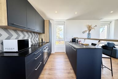 - Cuisine ouverte aménagée et équipée, réfrigérateur, four, lave-vaisselle, plaque électrique, grille-pain, cafetière à l'italienne et pas de bouilloire dans la cuisine.