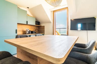 - Cuisine ouverte aménagée et équipée (four, réfrigérateur, micro-onde, lave-vaisselle, cafetière, grille-pain, bouilloire) avec son îlot central convivial.