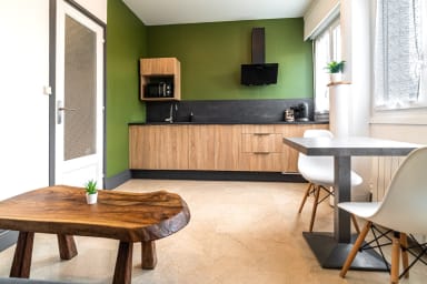 - Pièce de vie avec cuisine aménagée et équipée, réfrigérateur, micro-onde, cafetière, grille-pain, bouilloire.