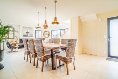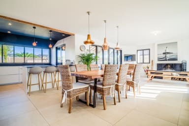 - Salle à manger avec sa grande table pouvant accueillir 8 personnes.