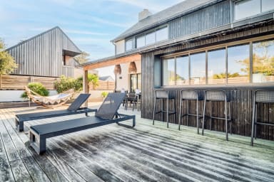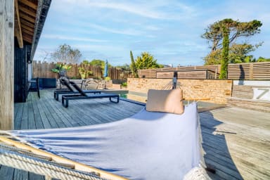 - Terrasse avec mobilier de jardin, table, chaises, parasol, barbecue, salon de jardin, transats, hamac.