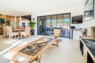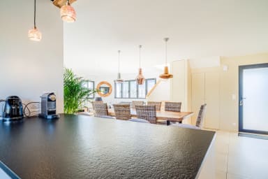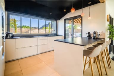- Cuisine ouverte aménagée et équipée, réfrigérateur, four, micro-onde, lave-vaisselle, bouilloire, grille-pain, cafetière, complètement ouverte sur l'extérieur.