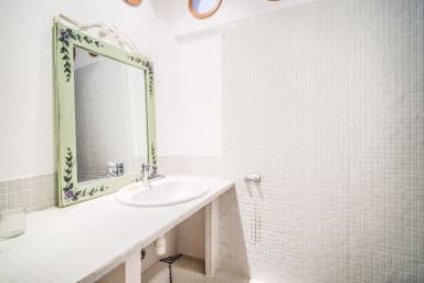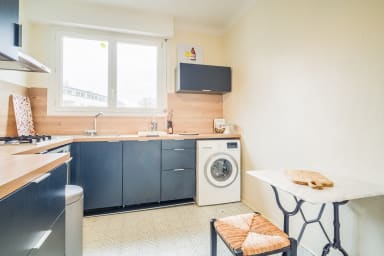 - Une cuisine fermée, aménagée et équipée : four, réfrigérateur, cafetière, grille-pain, bouilloire et lave-linge.