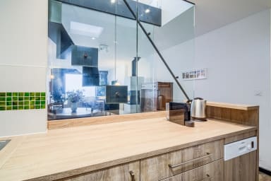 - Cuisine ouverte aménagée et équipée : four, micro-ondes, réfrigérateur, congélateur, lave-vaisselle, grille-pain, bouilloire, cafetière