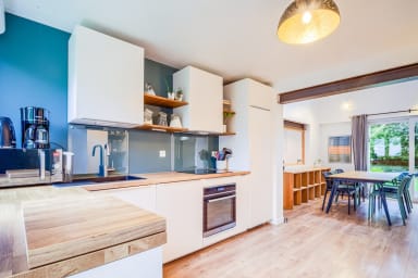 - Cuisine aménagée et équipée : four, micro-ondes, réfrigérateur, lave-vaisselle, grille-pain, bouilloire, cafetière