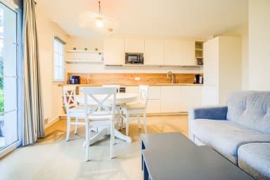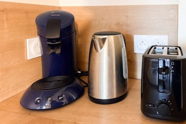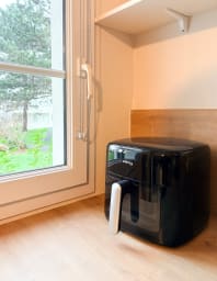 - Une cuisine ouverte, aménagée et équipée : four, airfryer, lave-vaisselle, cafetière, grille-pain, bouilloire, plaque de cuisson