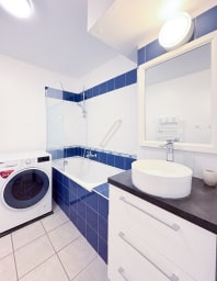 - Une salle de bain avec baignoire, WC et lave-linge séchant