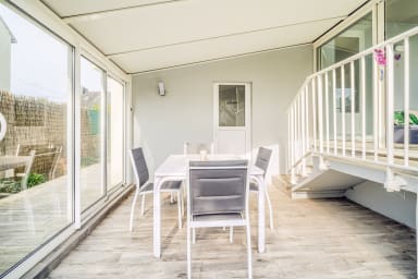 - Grande véranda sans vis-à-vis avec table à manger et accès direct au jardin