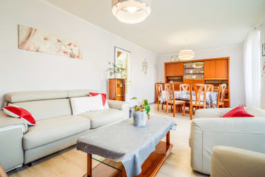 - Séjour avec coin salon, canapé, fauteuil, table basse et télévision