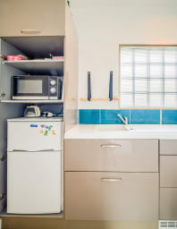 - Cuisine aménagée et équipée : four micro-ondes, réfrigérateur, bouilloire, grille-pain, cafetière