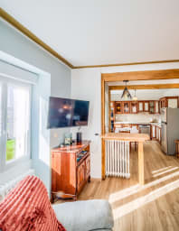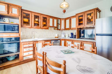 - Cuisine ouverte aménagée et équipée, four, micro-ondes, réfrigérateur, bouilloire, cafetière, grille-pain, lave-vaisselle.