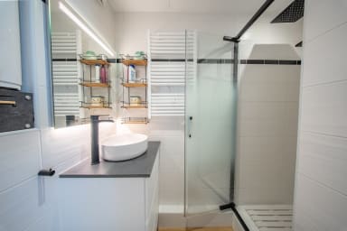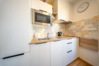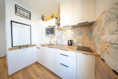 - Cuisine ouverte et aménagée, four micro-ondes, réfrigérateur, plaques de cuisson, grille-pain, bouilloire, cafetière et son lave-linge