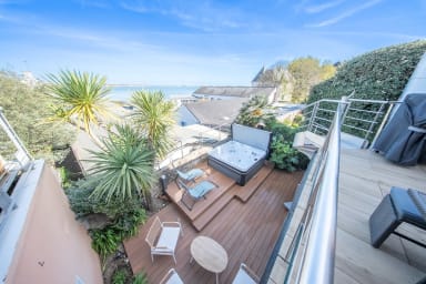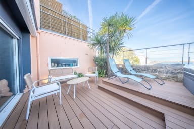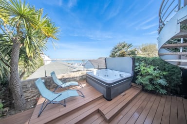 - Terrasse avec mobilier de jardin et jacuzzi vue mer.