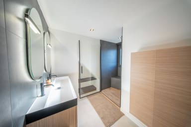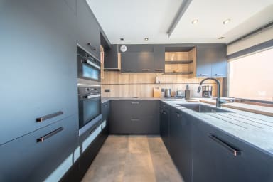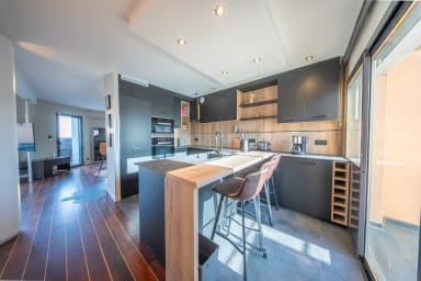 - Cuisine ouverte aménagée et équipée (réfrigérateur, four, micro-ondes, lave-vaisselle, grille-pain, bouilloire, cafetière).